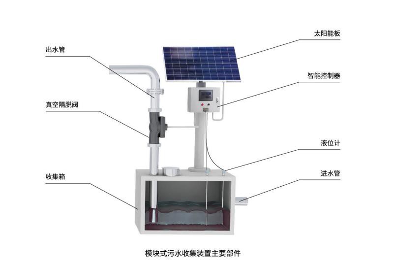 模塊式污水收集裝置是整套負壓排水系統(tǒng)的核心控制元件,也是負壓排水系統(tǒng)得以實現(xiàn)的關(guān)鍵設(shè)備。模塊式污水收集裝置根據(jù)現(xiàn)場情況靈活安裝,設(shè)備采用中部進水,上部出水的設(shè)計。進水口有四個方向,可根據(jù)現(xiàn)場情況靈活調(diào)整安裝方式。此設(shè)備主要功能是控制收集的污水有序進入負壓管網(wǎng),無空氣進入。