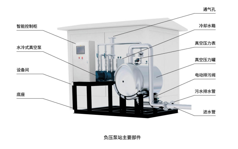 負壓站是負壓排水系統(tǒng)的動力源站,主要由真空壓力罐、真空泵,排污泵、物聯(lián)網(wǎng)智慧控制系統(tǒng)組成。收集來的污水在負壓梯度力的輸送作用下經(jīng)負壓污水管網(wǎng)進入真空壓力罐。當污水收集罐內(nèi)的污水液位上升到設(shè)定值時,排污泵啟動或排污閥打開,將污水排至一體化污水處理設(shè)備或市政污水管網(wǎng)。
